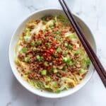 The image shows a bowl filled with a colorful dish that has several layers. The bottom layer is made of cooked shredded cabbage that is light green and slightly soft. On top of this, there is a layer of cooked ground meat that is brown and crumbly. Scattered over the meat are chopped green onions adding bright green spots all over the dish. There are red chili flakes sprinkled on top, adding small red dots for a spicy look. Two dark brown chopsticks are placed inside the bowl, ready to pick up the food. The bowl is white with a simple design, sitting on a white marbled surface. Photo taken with an iphone --ar 4:5 --v 7