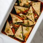 - Step 1: Cut the tofu into ⅓ inch thick triangular slices and place them in a large casserole dish. Set aside.