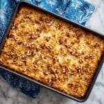 The image shows a close-up of a rectangular baked dessert in a black pan, covered with a top golden-brown layer made of shredded coconut mixed with chopped pecans. The texture of the topping is rough and slightly moist, with the pecans scattered evenly, giving a nutty appearance with hints of shiny caramelization. The dessert underneath the topping is only slightly visible at the edges, suggesting a soft, moist cake beneath the coconut and nut layer. The pan is placed on a white marbled surface with a blue patterned cloth next to it. photo taken with an iphone --ar 4:5 --v 7