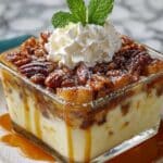 Bread pudding is a warm, comforting dessert that transforms simple bread into a rich, custardy treat. This recipe adds a delightful pecan topping and a hint of bourbon for an extra layer of flavor. Perfect for cozy gatherings or a special family dessert.