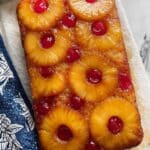 Store leftover pineapple upside down cake in an airtight container at room temperature for up to 2 days. For longer storage, refrigerate for up to 5 days. Reheat individual servings gently in the microwave for 15–20 seconds to enjoy the cake warm again.