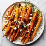 This elegant side dish features tender roasted carrots coated with brown sugar and warm spices, topped with sweet and salty candied pecans, creamy goat cheese, and fresh thyme for a perfect balance of flavors and textures. Ideal for holiday dinners or any special occasion.