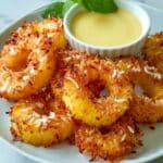 Keywords: Rum Soaked Pineapple, Fried Pineapple Rings, Tropical Dessert, Coconut Coated Pineapple, Cream Cheese Dipping Sauce