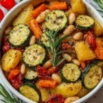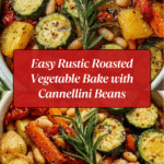 This Rustic Roasted Vegetable Bake with Cannellini Beans is a hearty, flavorful dish featuring a medley of tender roasted vegetables combined with creamy cannellini beans. Perfect as a wholesome vegetarian main or a vibrant side, it’s seasoned with garlic, oregano, and herbs, then finished with a touch of Parmesan and fresh rosemary or thyme for an aromatic touch.