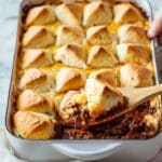 Store any leftovers in an airtight container in the refrigerator for up to 3 days. To reheat, place the bake in a preheated 350°F oven for about 10–15 minutes until warmed through and the biscuits regain some crispness. Avoid microwaving to prevent soggy biscuits.
