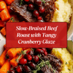This Slow-Braised Beef Roast with Cranberry Balsamic Glaze is a comforting and flavorful dish perfect for a cozy dinner. Tender beef roast is seared and then slow-cooked with aromatic herbs, garlic, and a sweet-tart cranberry balsamic glaze, accompanied by carrots and fresh cranberries. The rich sauce is reduced to a glossy finish, creating a deliciously balanced meal that highlights the perfect combination of savory and fruity flavors.
