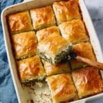 - Use a sharp serrated knife to cut the spanakopita before baking to keep clean edges.