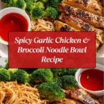 Keywords: Spicy garlic chicken, broccoli noodles, stir-fry, quick dinner, Asian chicken recipe, healthy chicken bowl