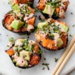 These Spicy Salmon Rice Muffins are a delicious fusion of sushi flavors and convenient muffin form, perfect for a flavorful appetizer or snack. Featuring marinated salmon baked atop seasoned sushi rice wrapped in crisp nori, and topped with creamy spicy mayo, avocado, green onions, and toasted sesame seeds, they deliver a delightful burst of smoky, spicy, and savory tastes with every bite.