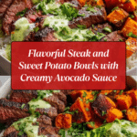 These Steak and Sweet Potato Bowls with Avocado-Cilantro Drizzle are a flavorful and nourishing meal perfect for any day of the week. Combining tender marinated steak, roasted sweet potatoes, and a creamy, zesty sauce creates a satisfying balance of tastes and textures.