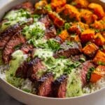 These Steak and Sweet Potato Bowls with Avocado-Cilantro Drizzle are a flavorful and nourishing meal perfect for any day of the week. Combining tender marinated steak, roasted sweet potatoes, and a creamy, zesty sauce creates a satisfying balance of tastes and textures.