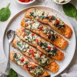 A delicious and healthy stuffed salmon recipe featuring tender salmon fillets filled with a flavorful mixture of sautéed spinach, tangy feta, parmesan, and roasted red peppers. Ready in just 30 minutes, this baked stuffed salmon is perfect for a quick yet impressive meal.