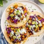 - Serve: Warm the tortillas and fill them with the sweet potato and black bean mixture. Drizzle with the cilantro crema and top with shredded cabbage, diced avocado, sliced green onions, fresh cilantro, or any other desired toppings.