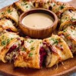 This Thanksgiving Crescent Ring is a festive and delicious way to enjoy classic holiday flavors all wrapped in buttery crescent rolls. Filled with creamy mashed potatoes, savory stuffing, shredded turkey, and a dollop of tart cranberry sauce, these crescent rolls are baked to golden perfection and served with warm gravy and fresh parsley garnish. Perfect as an appetizer or main dish for your Thanksgiving feast.