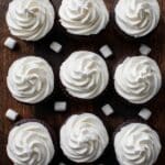 Nine chocolate cupcakes are neatly placed in a 3 by 3 grid on a dark wooden surface with scattered small white marshmallows around them. Each cupcake has one thick, soft layer of rich, dark brown cake topped with a large swirl of smooth, white whipped cream frosting that is piped in a circular motion creating a soft, fluffy texture with defined ridges. The deep dark cake contrasts sharply with the bright white frosting, making the frosting look light and airy. The photo is taken from a top-down view with even light that highlights the creamy texture and swirl pattern, with no edges of plates or bowls visible. Photo taken with an iphone --ar 4:5 --v 7