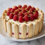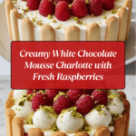 This elegant White Chocolate Mousse Charlotte with Raspberries is a light and creamy dessert featuring a luscious white chocolate mousse layered with fresh raspberries and encased in delicate savoiardi biscuits. Topped with crunchy crushed pistachios, it’s a perfect balance of smooth, fruity, and nutty flavors, ideal for entertaining or special occasions.