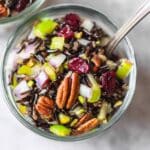 Keywords: wild rice salad, cranberry salad, nutty salad, healthy salad, vegetarian salad, apple cider dressing, pecans, pistachios